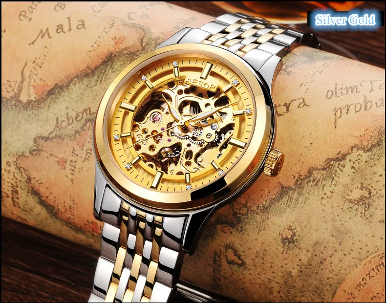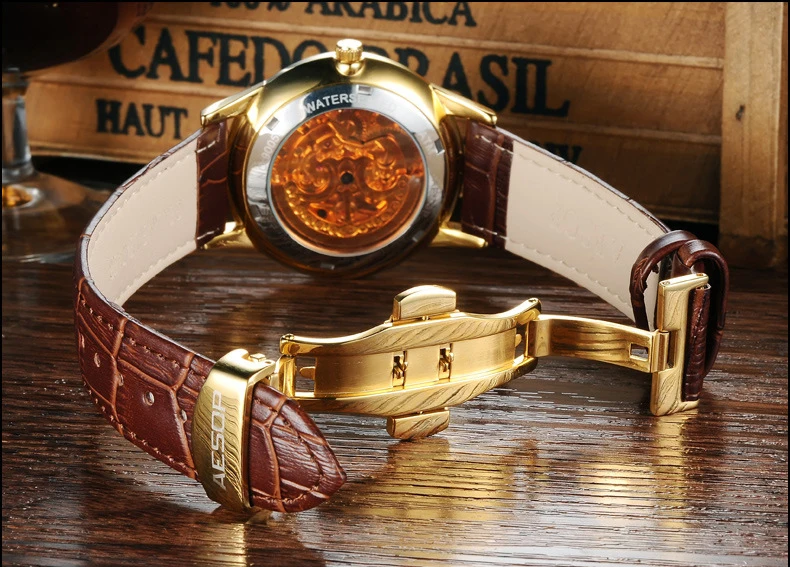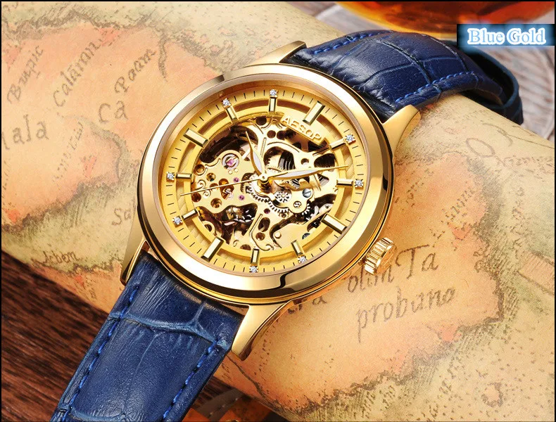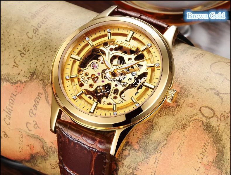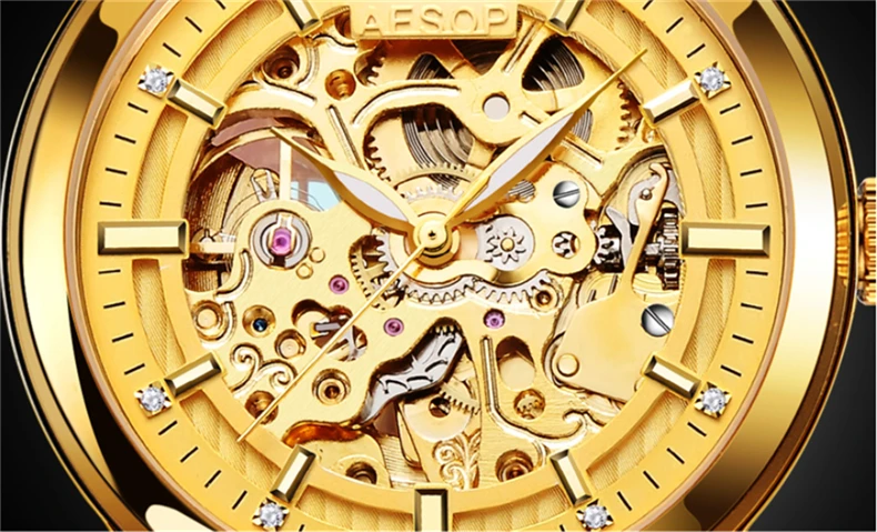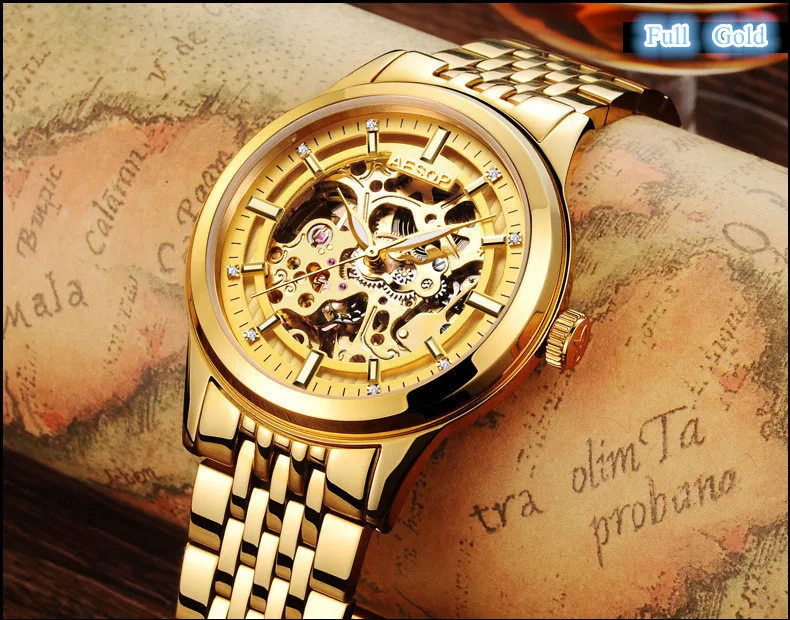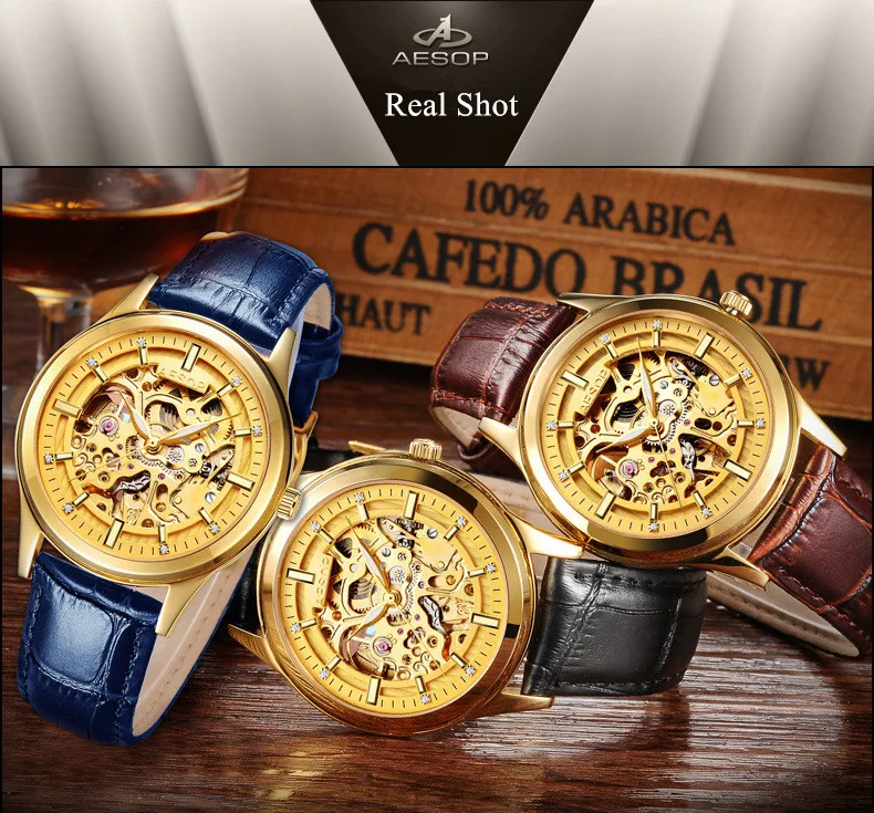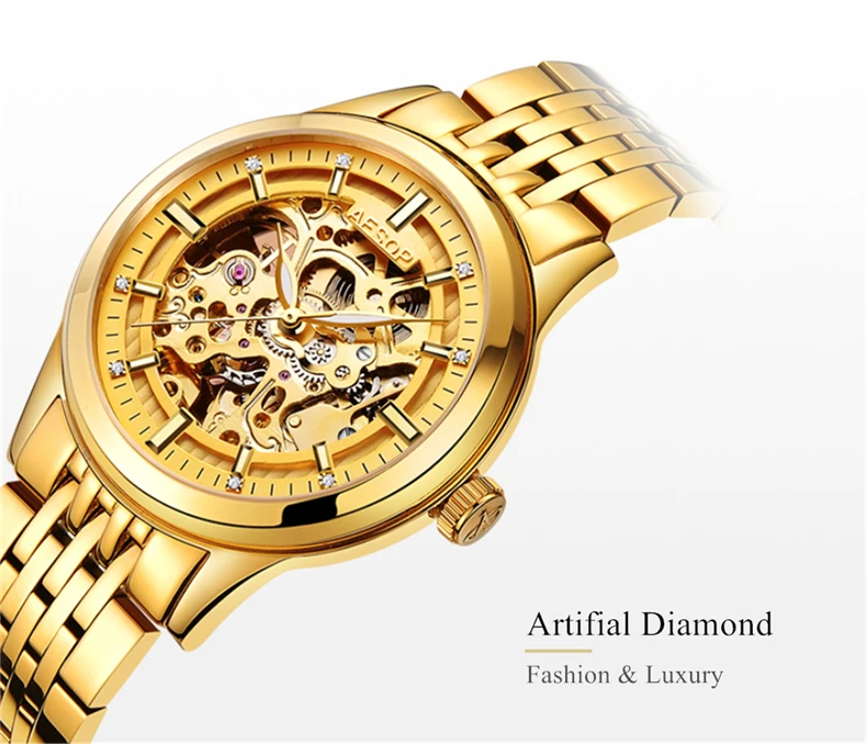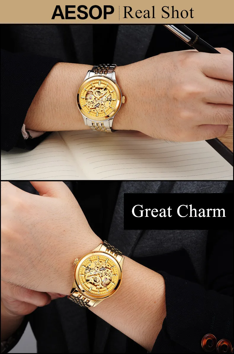 Aesop ouro relógio automático homem mulher casal amante moda luminosa esqueleto mecânico relógio de pulso luxo reloj hombre mujer
