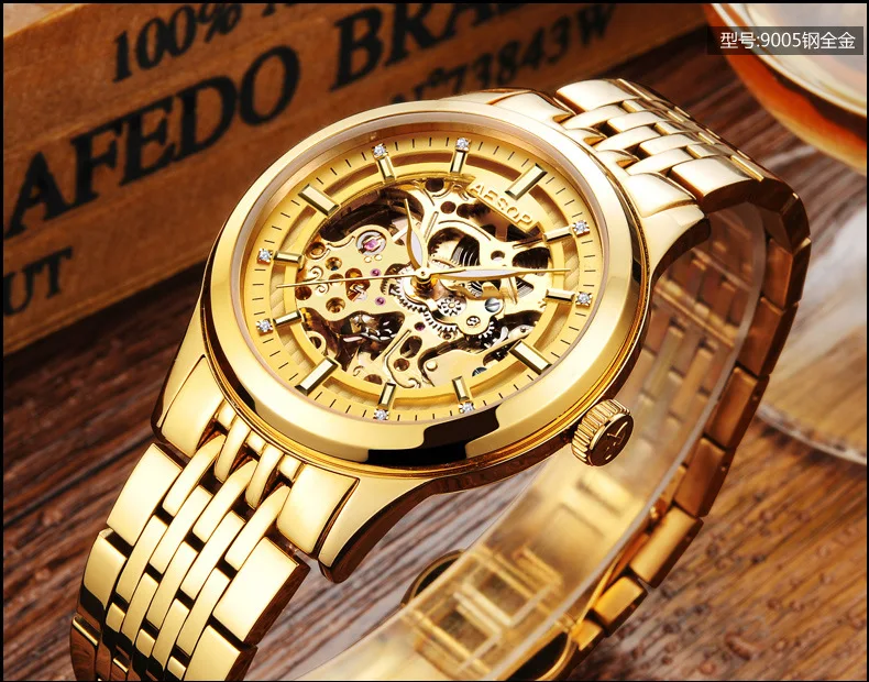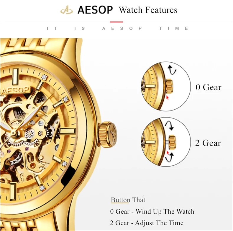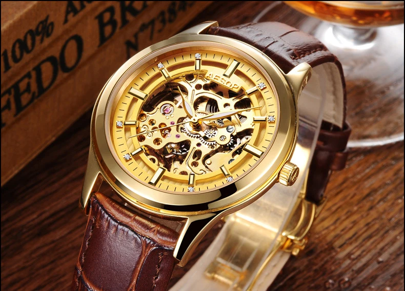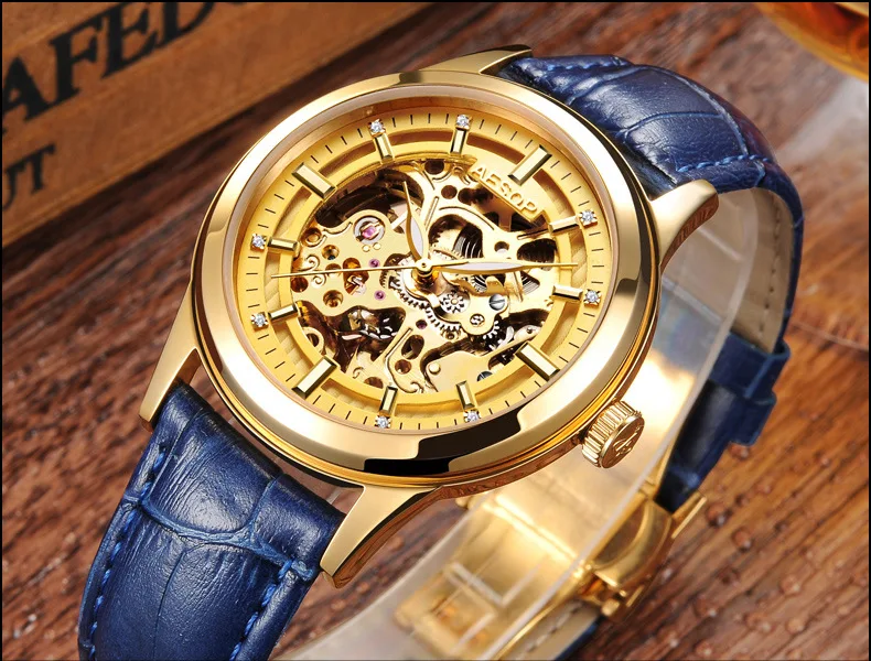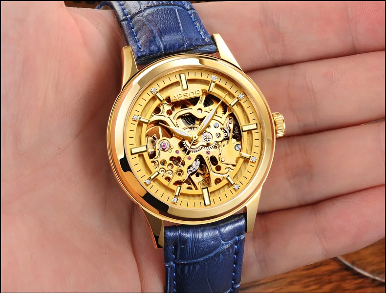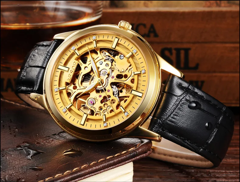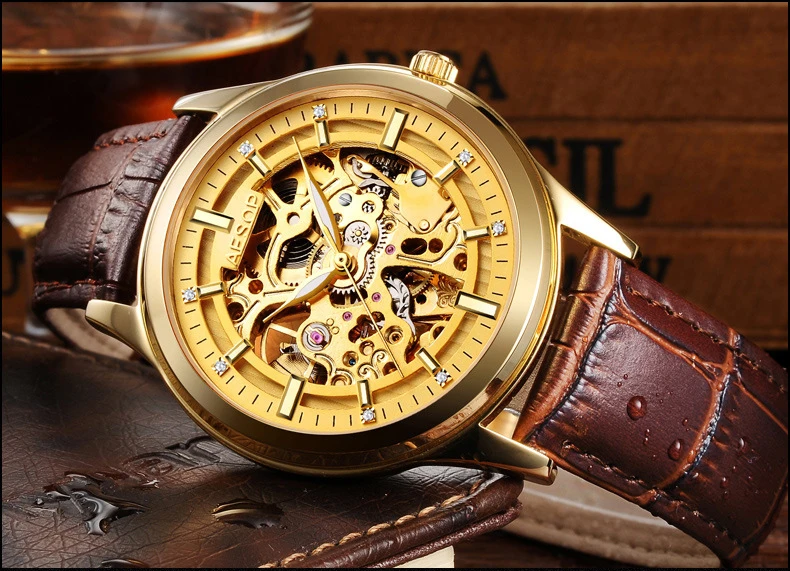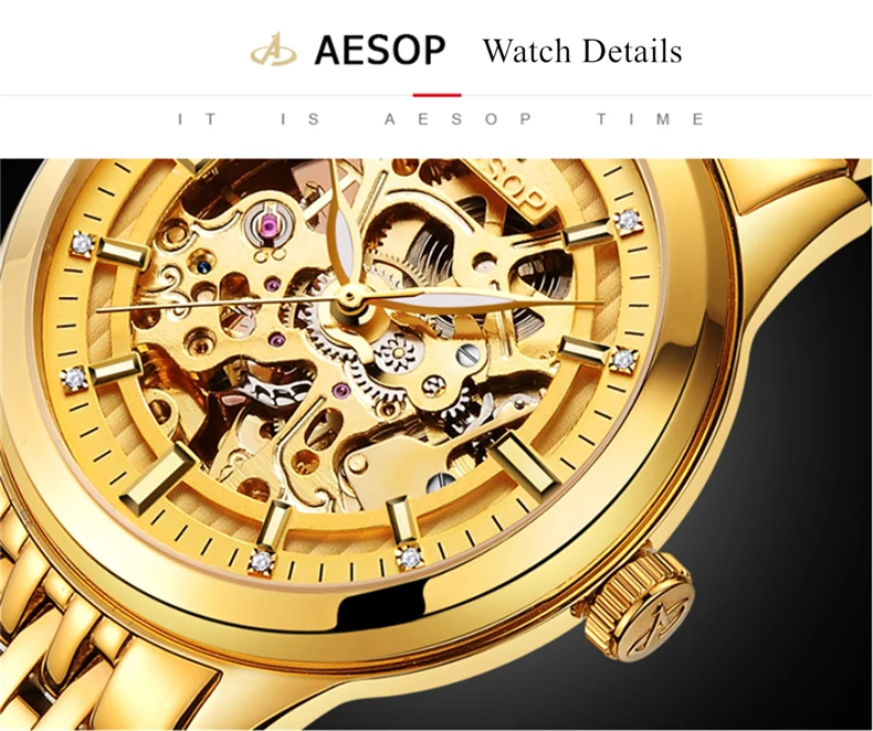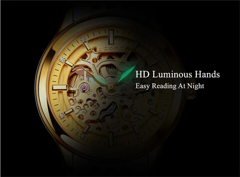 Aesop ouro relógio automático homem mulher casal amante moda luminosa esqueleto mecânico relógio de pulso luxo reloj hombre mujer
